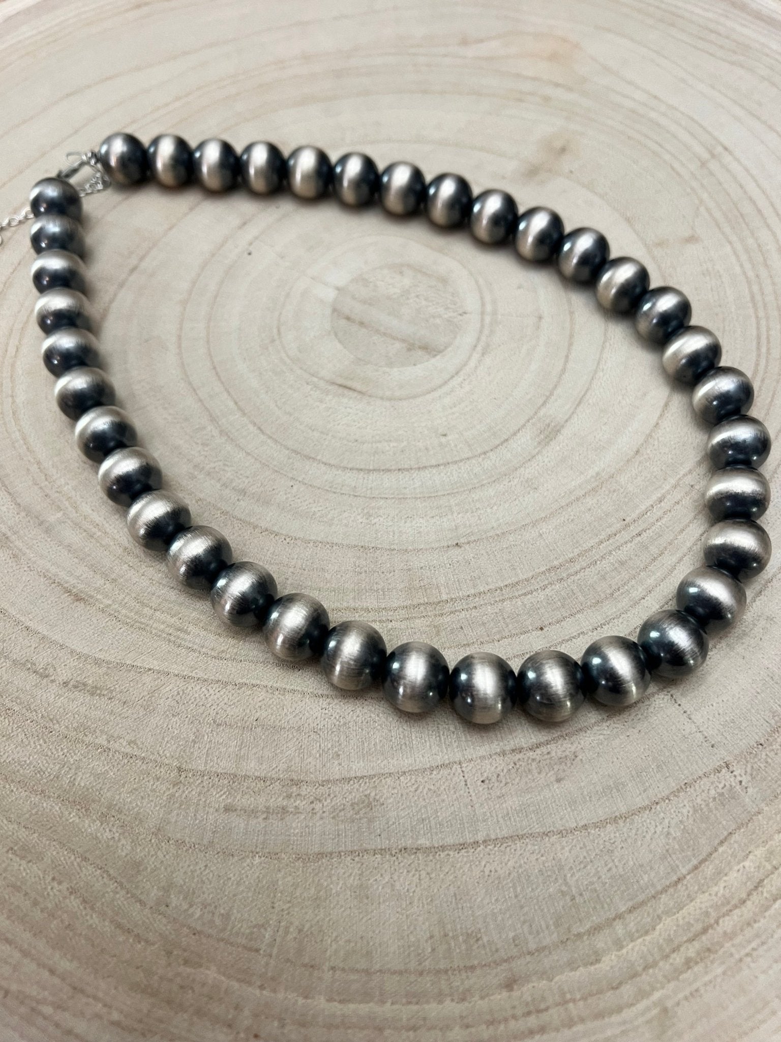 Enhance your jewelry collection with this 18-inch Navajo Pearl style necklace featuring 12mm Sterling silver beads and a 2-inch extender chain. Perfect for adding a BIG punch of casual elegance to any outfit, this necklace is a must-have.