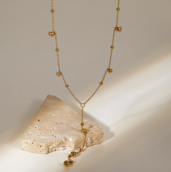 Stainless steel 18k gold ball Tassel necklace. This is a fun necklace to layer or wear as a stand alone
