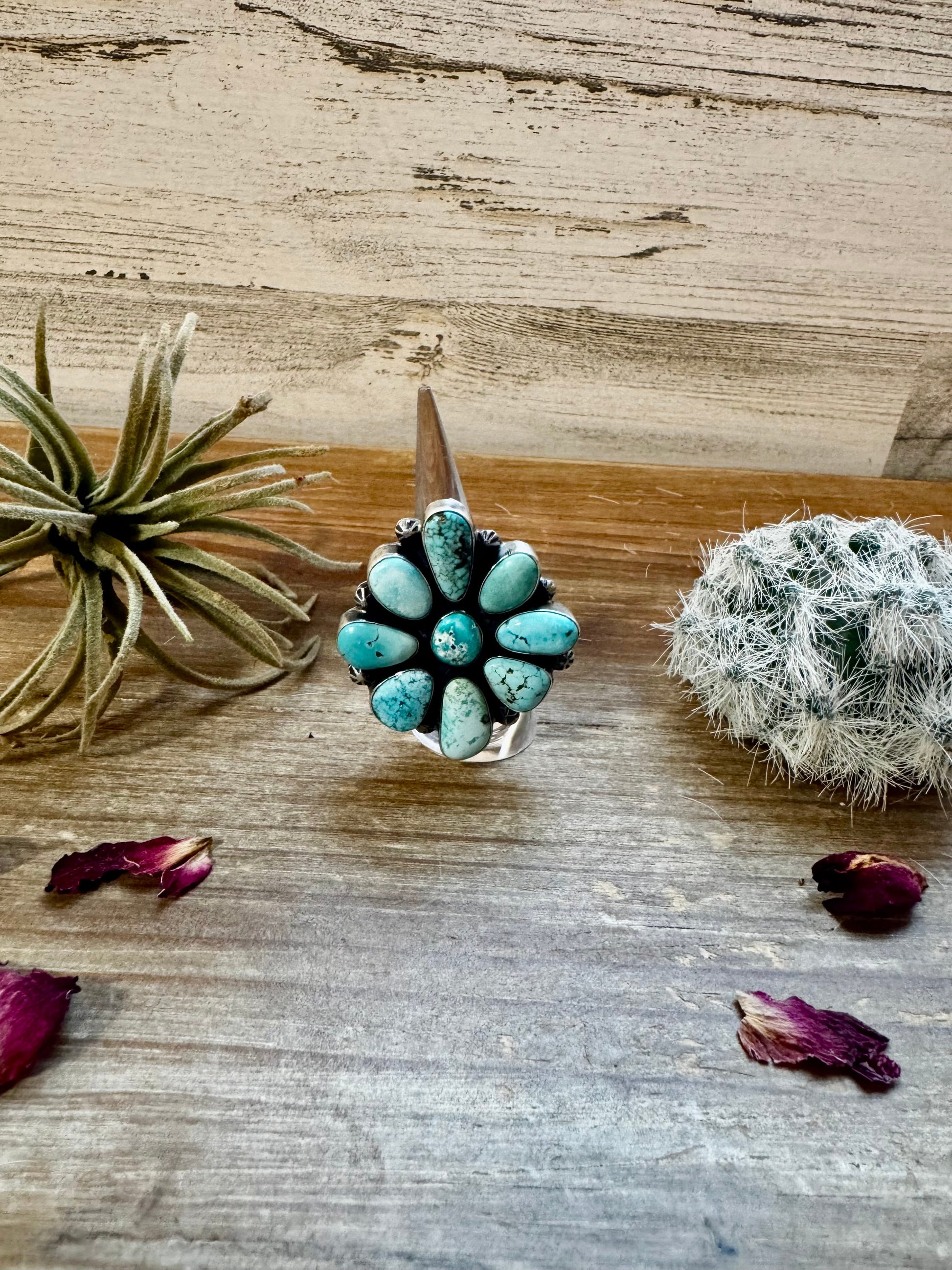 Big flower ring- size 7 1/2- Royston turquoise ring and sterling silver