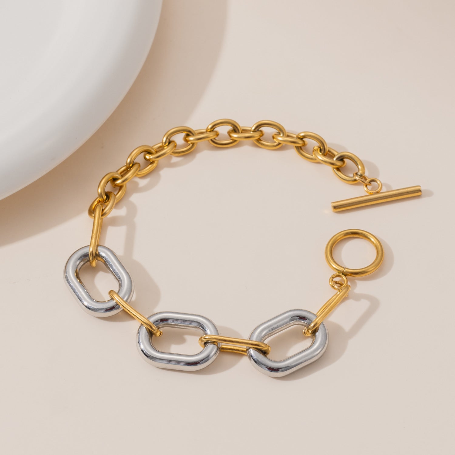 Add a little sparkle and edge with the Bria Bracelet! This fun two-tone chain link piece features an eye-catching geometric pattern with hollow elliptical shapes that play with light and color. The secure T-bar clasp keeps it comfortable for daily wear, while the 18K gold plating on stainless steel brings a touch of luxe. Perfect for layering or shining solo, the Bria Bracelet adds playful charm to any outfit.