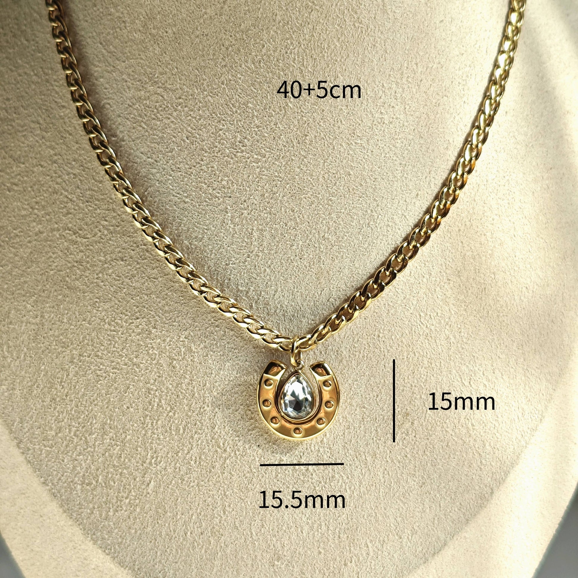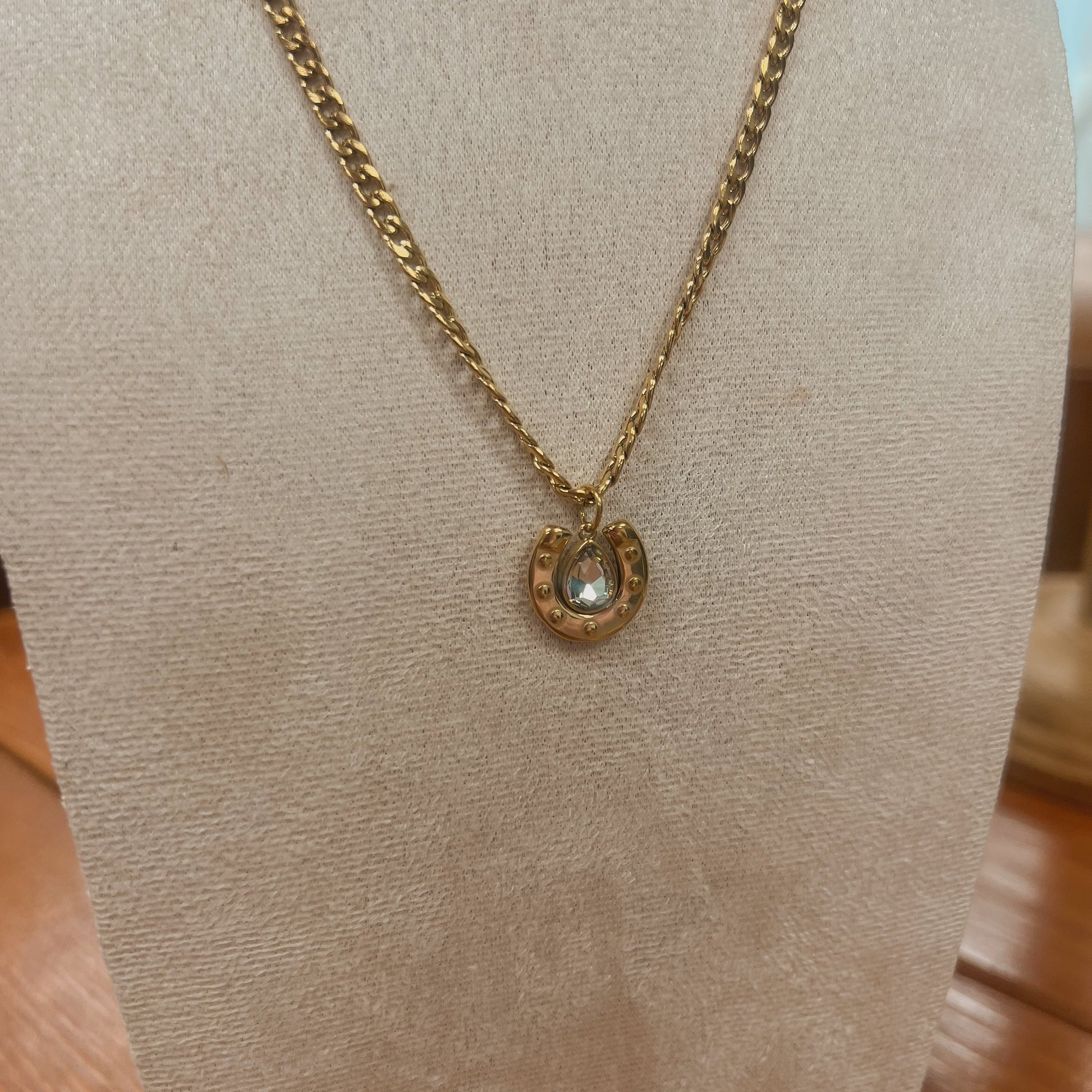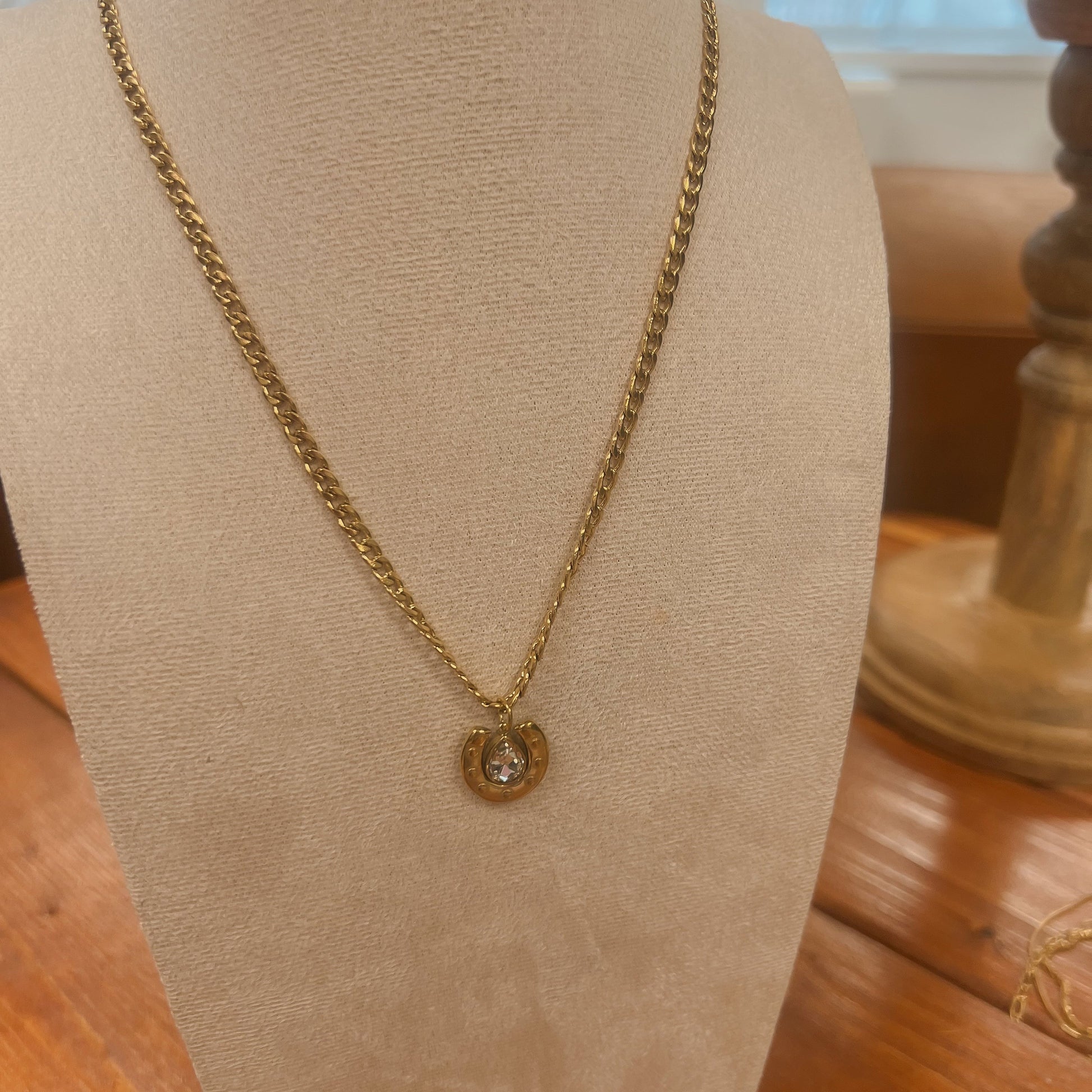 "Lasso in some luck with WS-Bucky! This stainless steel curb chain pendant features a Western horseshoe adorned with a sparkling cubic stone. Saddle up and add a touch of charm to your outfit with this quirky accessory. Yeehaw!"