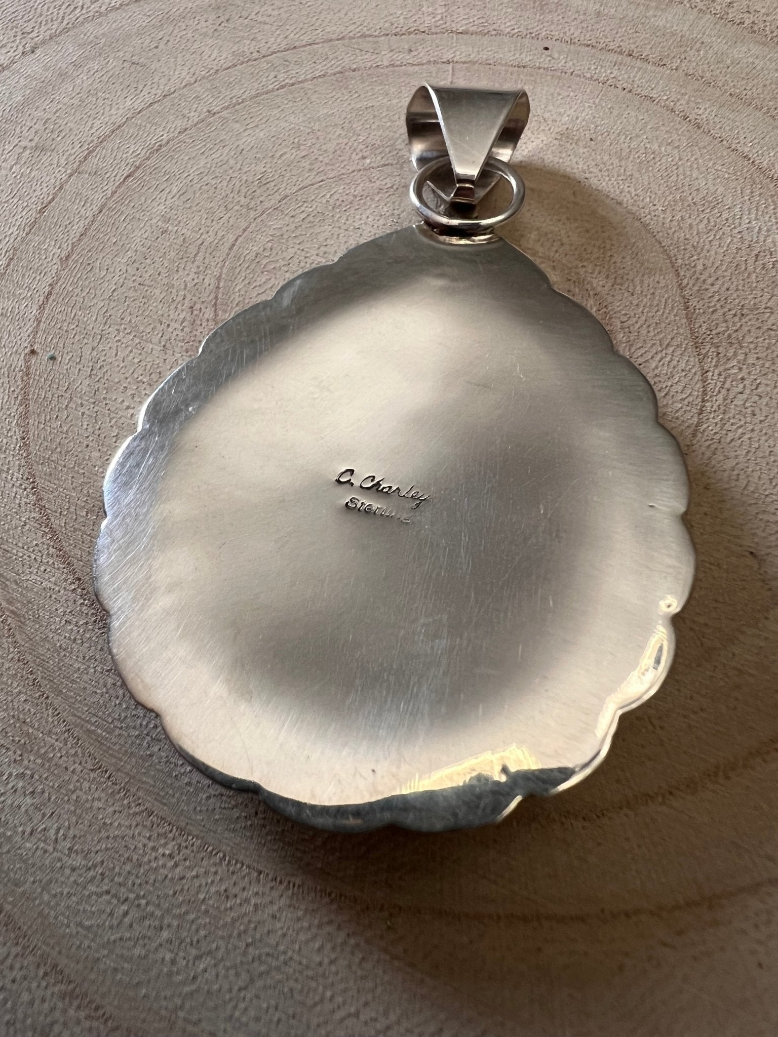 Crafted by Navajo silversmith Chester Charley, this authentic Sterling Silver & Turquoise pendant showcases genuine Western craftsmanship. Measuring a substantial 3" long by 1 3/4" wide, this hand-hallmarked piece carries the distinctive "C. Charley, Sterling" mark, guaranteeing its authenticity and heritage.