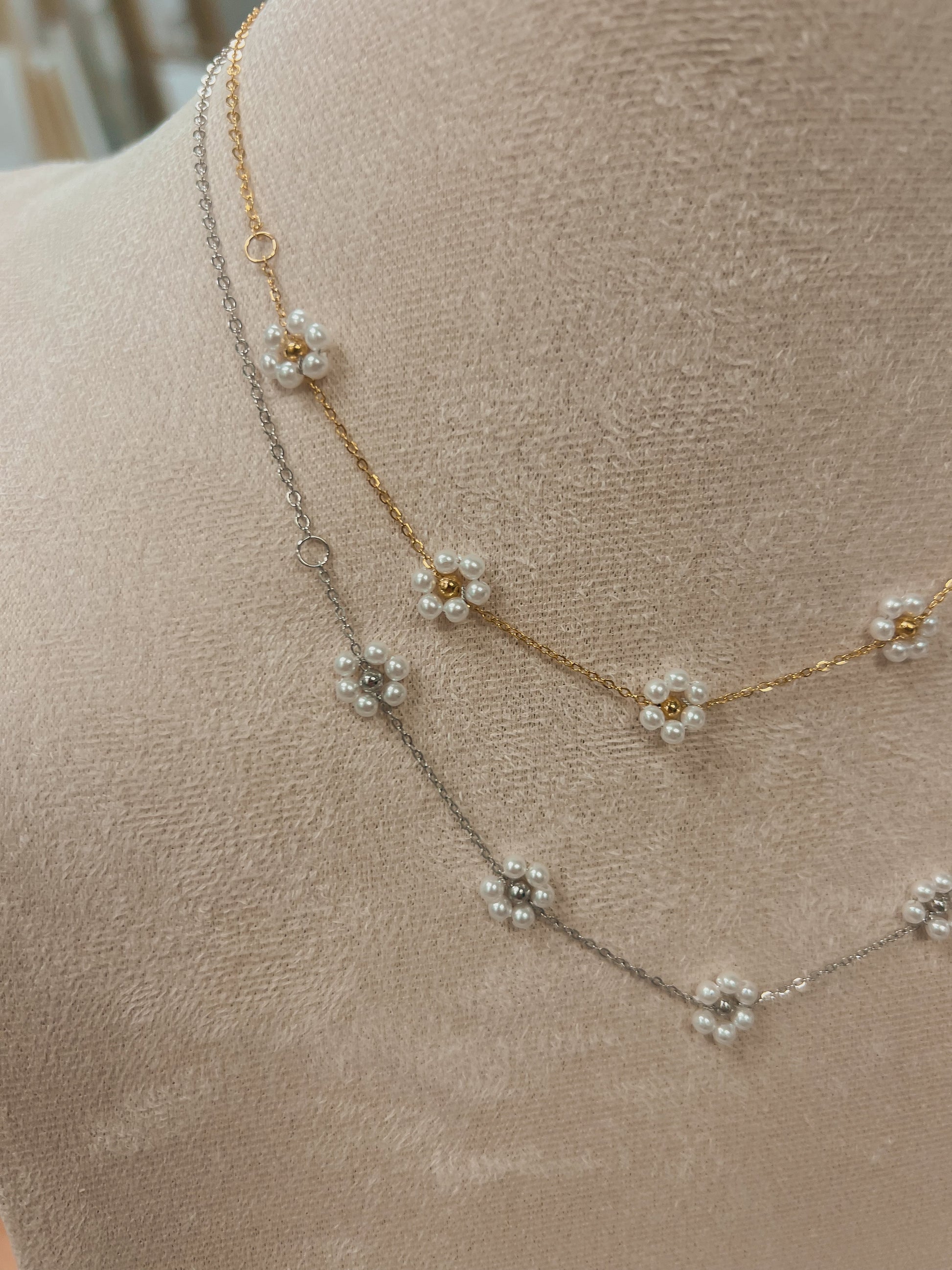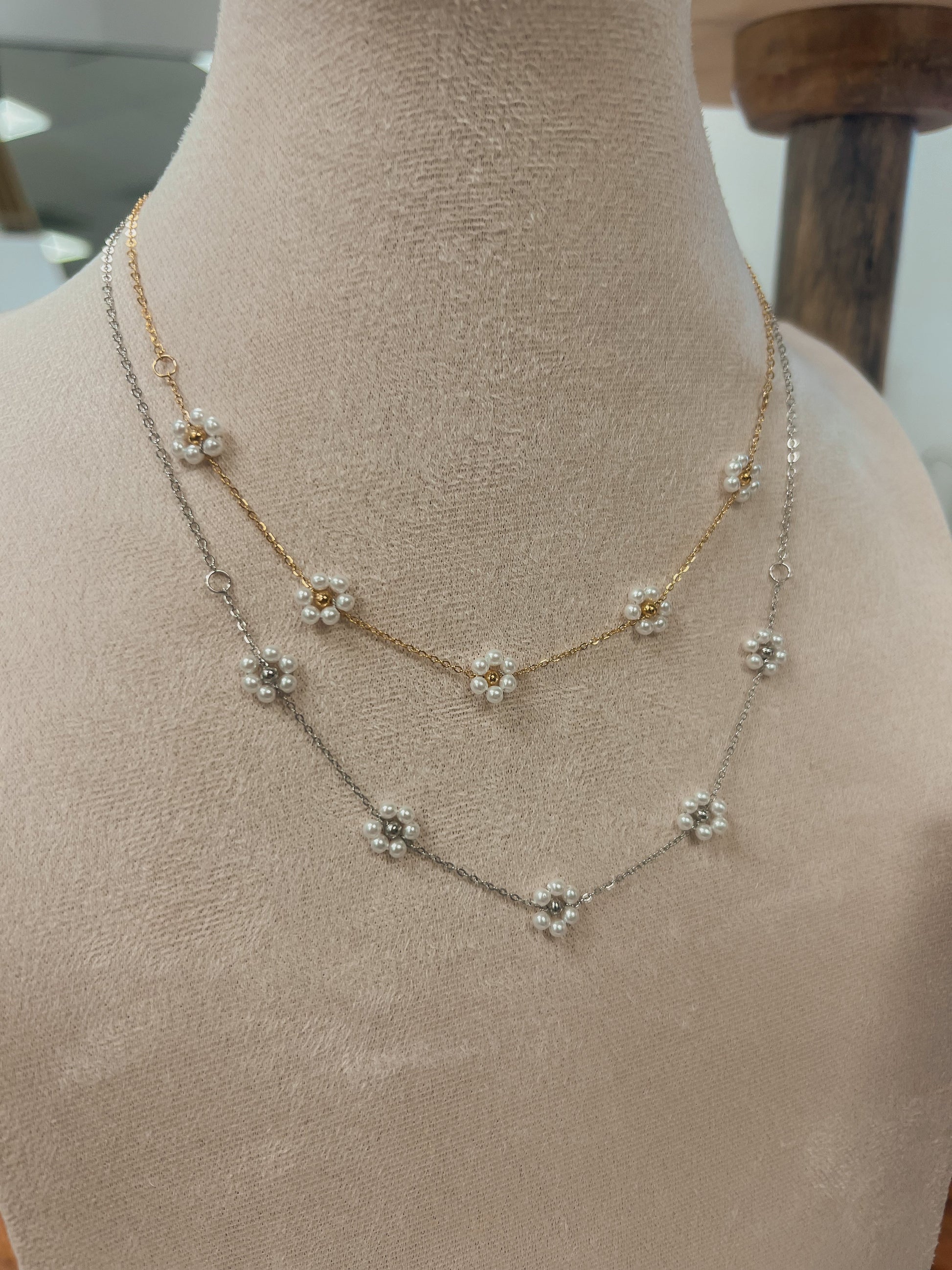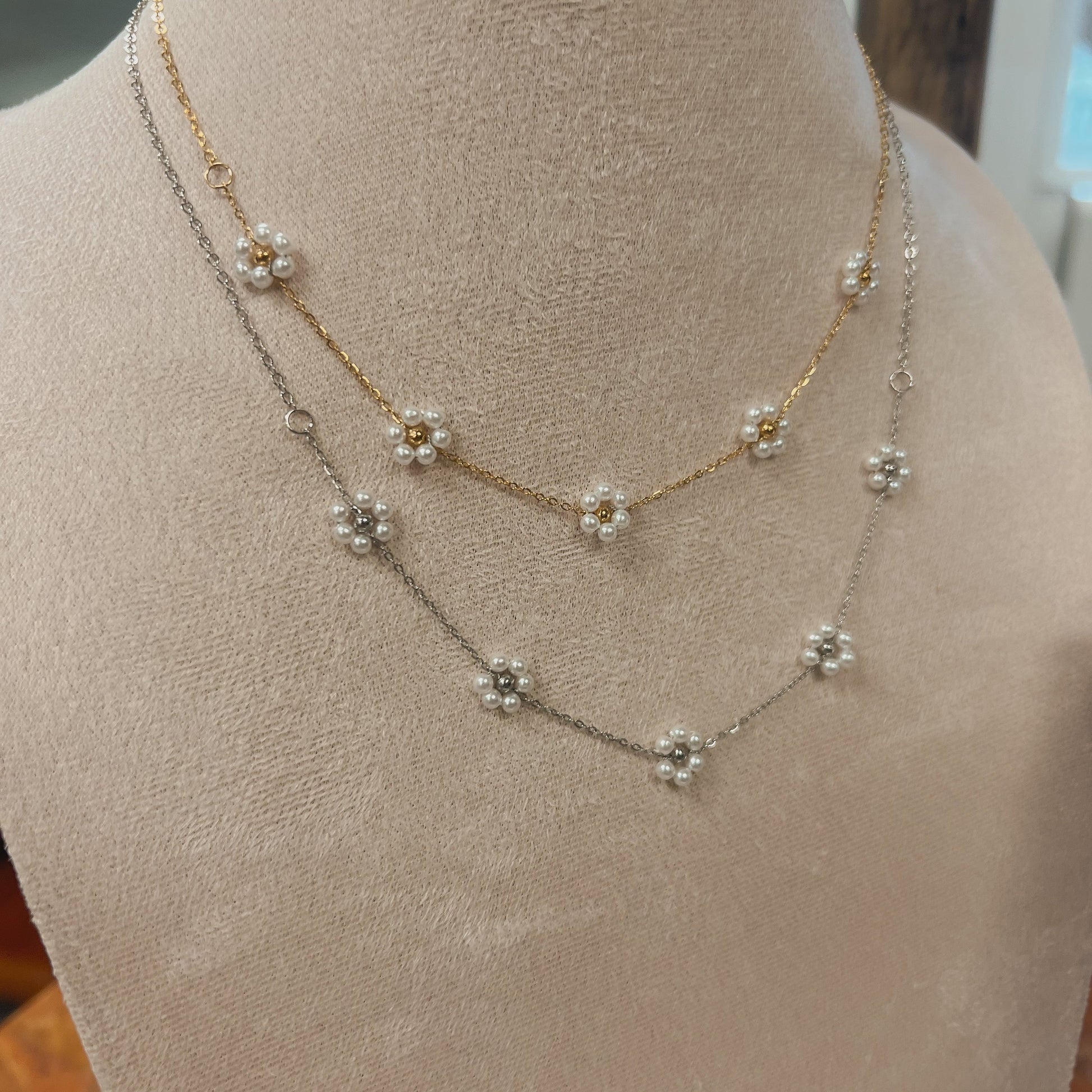 Unleash your inner flower child with Flower Child 2.0. This single strand necklace features multiple artificial pearl flowers, giving you a playful and unique accessory for any outfit. Embrace your bohemian side and stand out from the crowd. (Hippie vibes not included.)