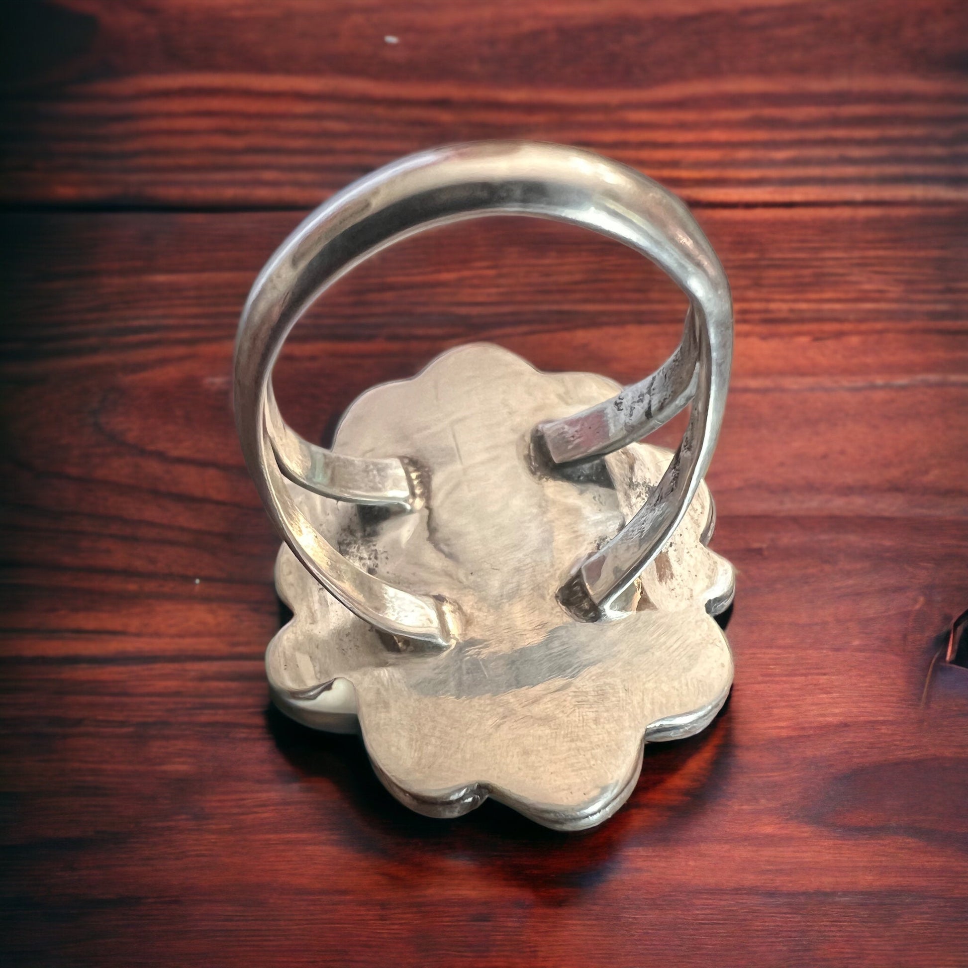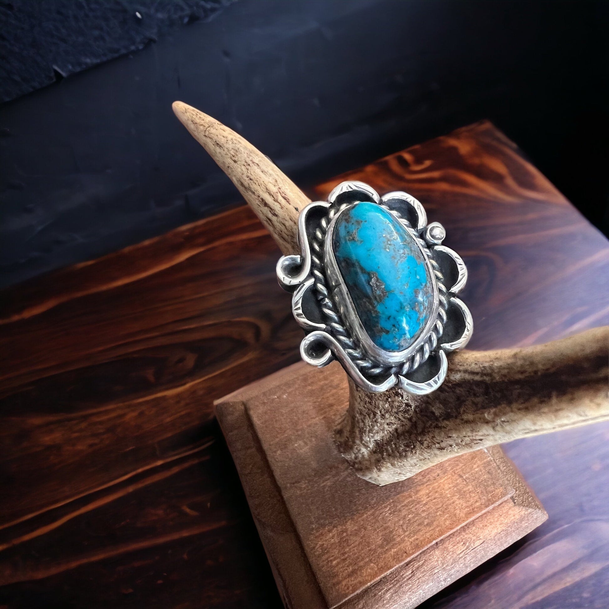 Turquoise ring - gorgeous large cabochon on sterling flower shaped base - size 7